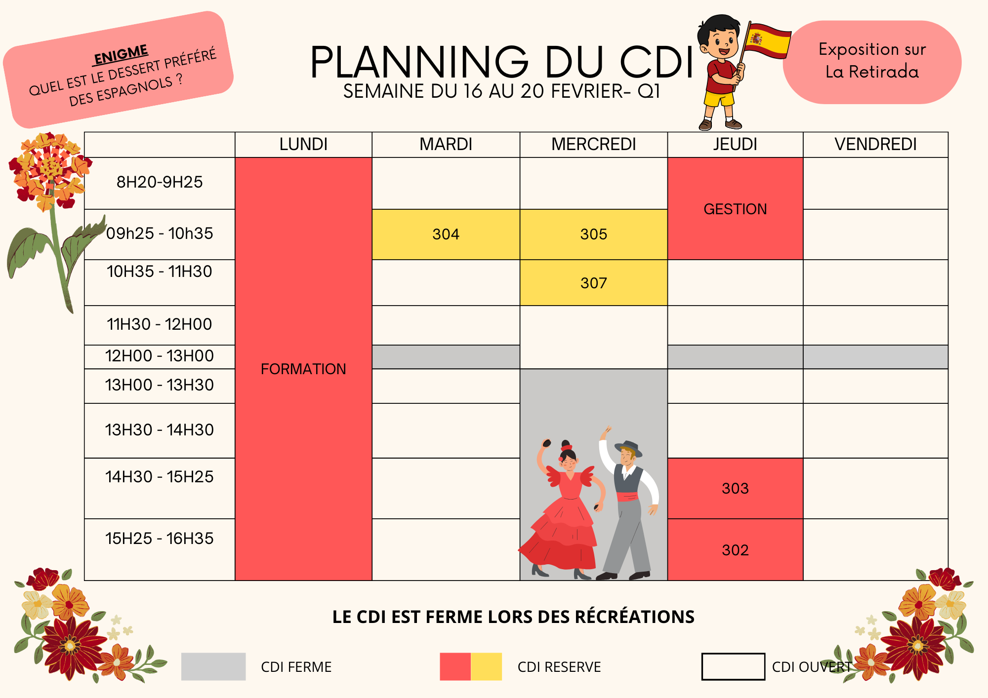 Regarde l'emploi du temps de la semaine ci-dessous pour savoir si le CDI n'est pas réservé par une classe !