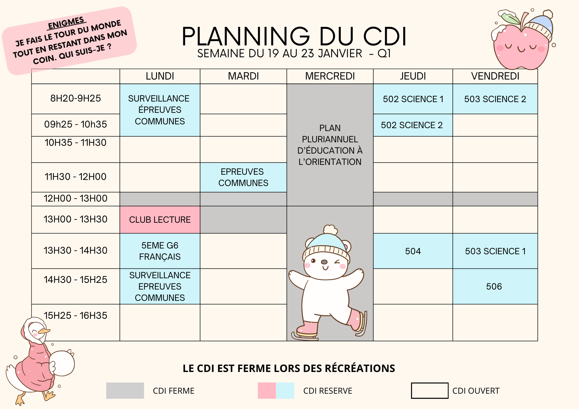 Regarde l'emploi du temps de la semaine ci-dessous pour savoir si le CDI n'est pas réservé par une classe !
